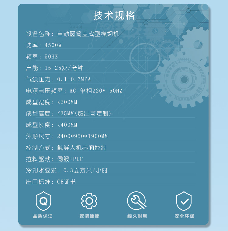 1、全自動(dòng)圓筒底蓋成型機(jī)模具采用壓板裝夾,方便調(diào)整和安裝。 三,全自動(dòng)PVC/PET圓筒蓋成型機(jī)技術(shù)規(guī)格: