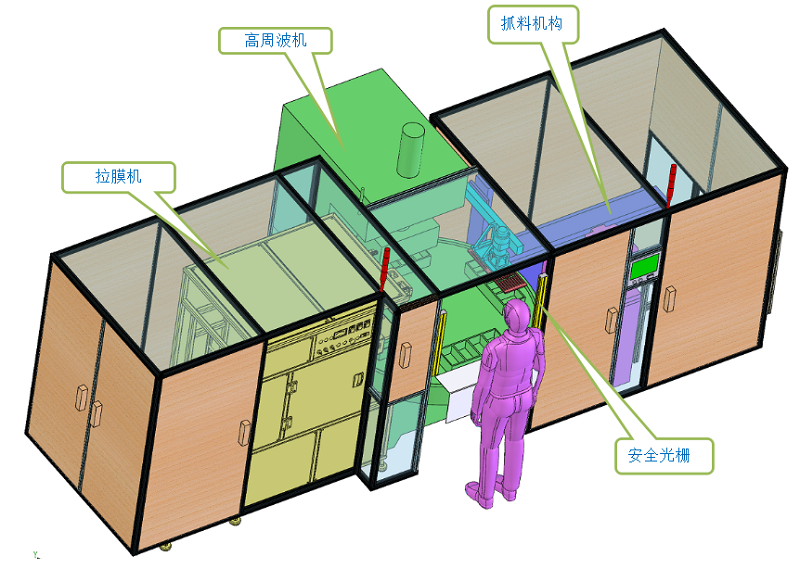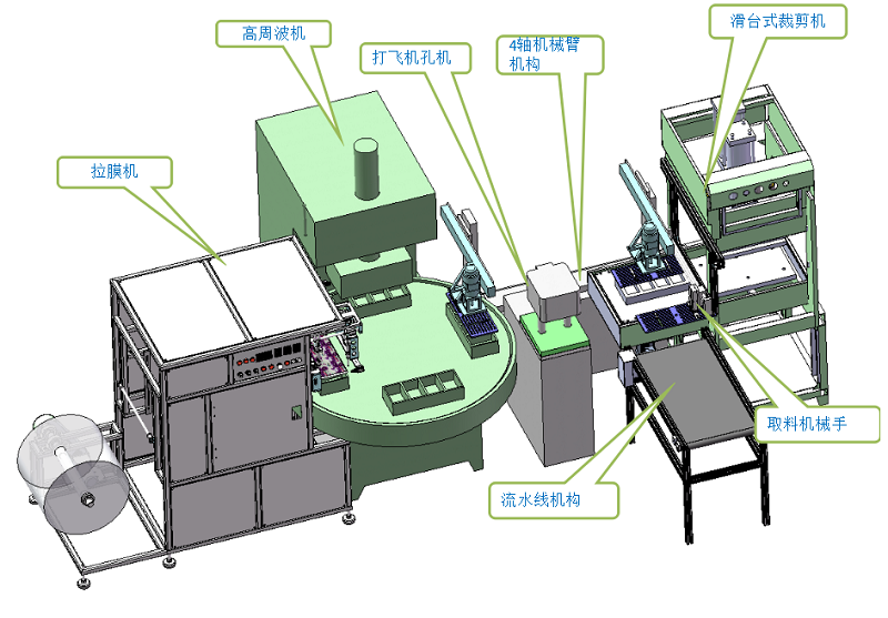 全自動(dòng)吸塑包裝機(jī):自動(dòng)拉膜切片+高頻焊接+沖飛機(jī)孔+裁切機(jī):