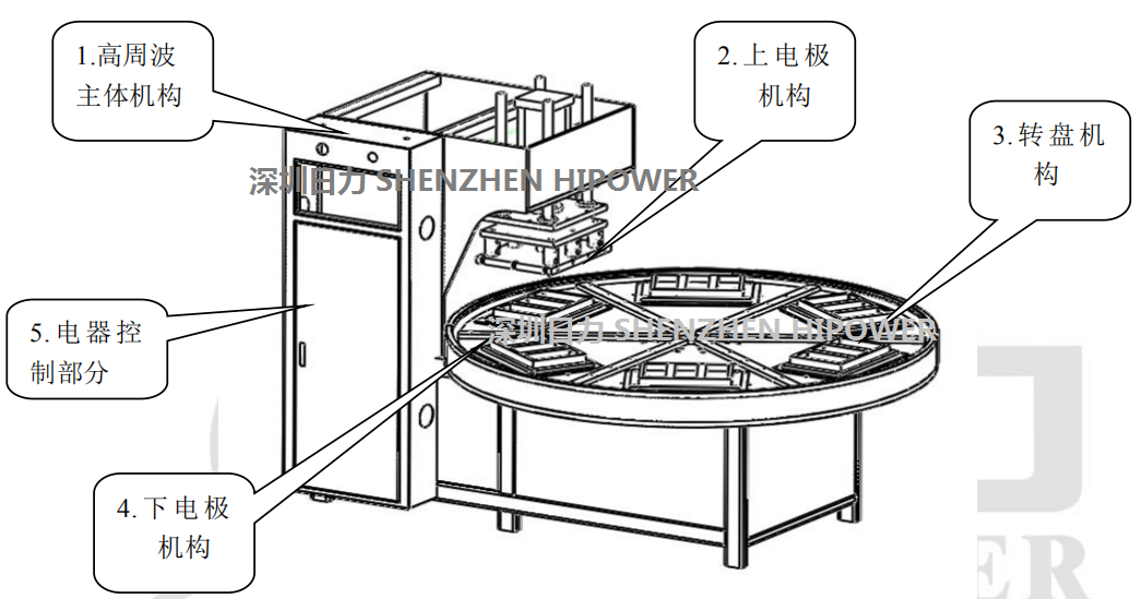 用途: 主要用于需要高周波熔接同時又必須同步裁斷的產品加工,高周波機的工作原理是利用高周波先熔接再通機器配有的壓力裝置同
